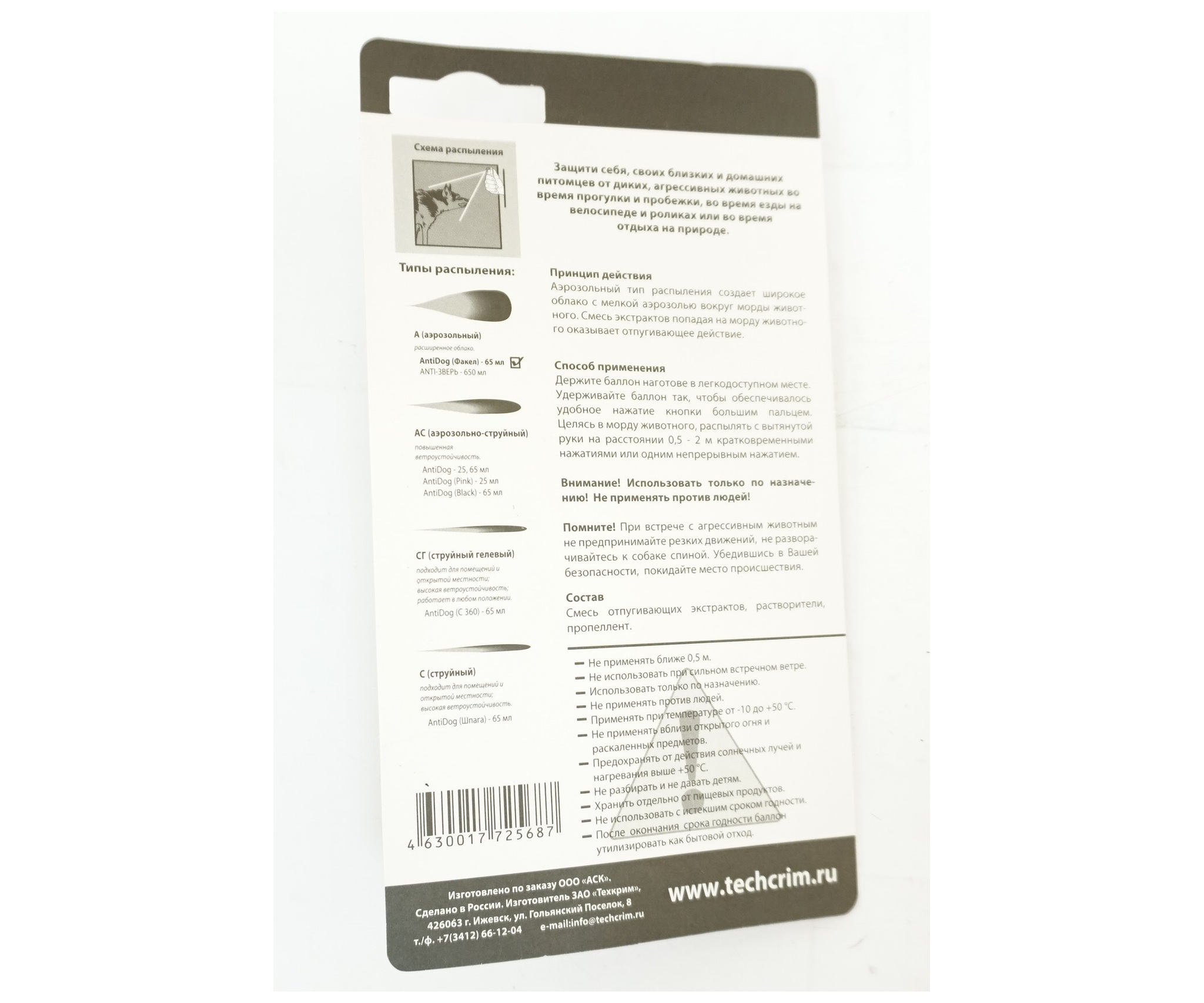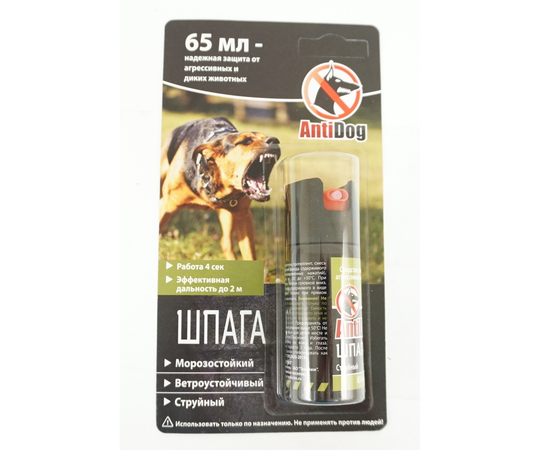 Распылитель (аэрозольный баллончик) AntiDog Шпага, 65 мл – это высокоэффективное средство от нападения собак, новая разработка российской компании «Техкрим». Продукт использует струйный тип распыления, и за счет невысокого респираторного эффекта подходит также для использования в помещениях. При нажатии на кнопку распылителя из него вырывается мощная струя специальной смеси, вызывающая крапивный эффект. За счет высокой эффективной дальности распыления (до 2,5 метров) он подходит для использования на средних дистанциях, позволяя не подпустить животное близко.