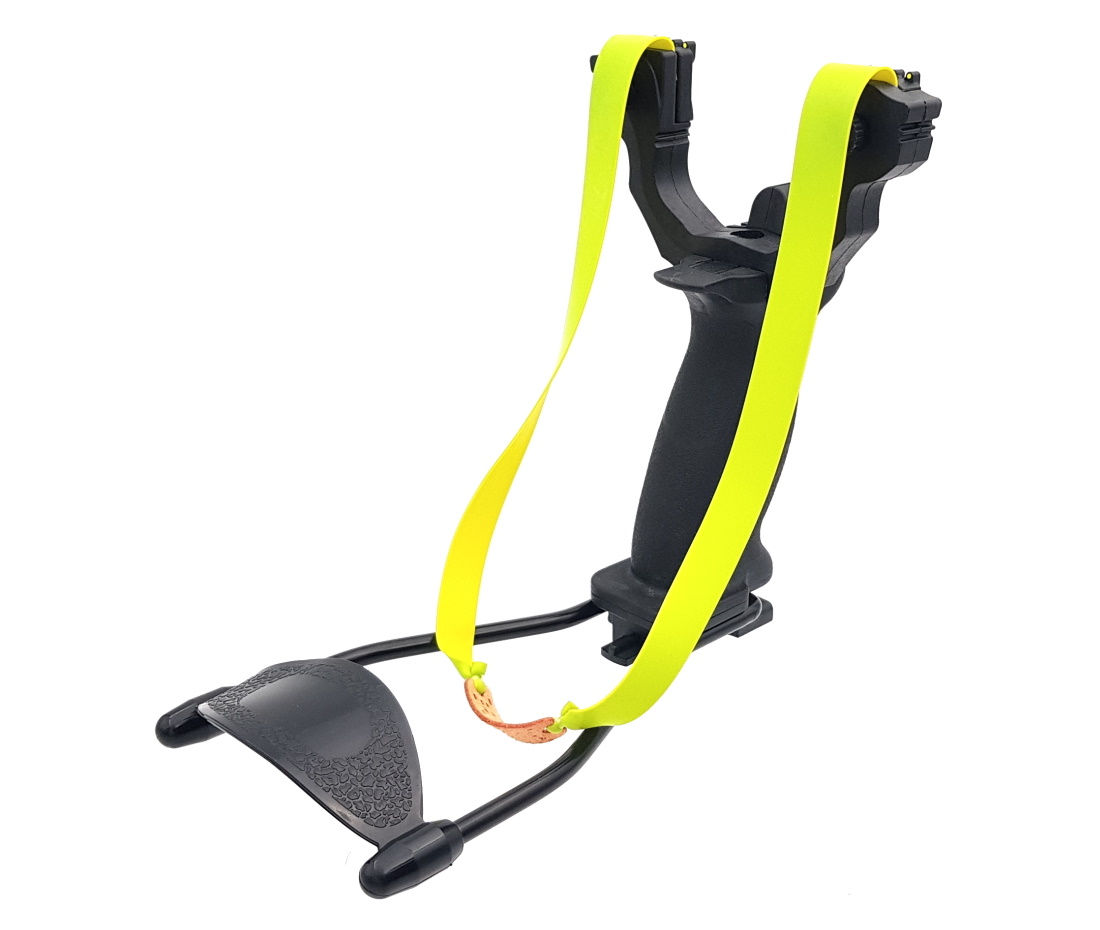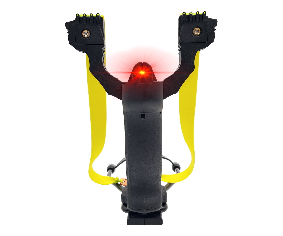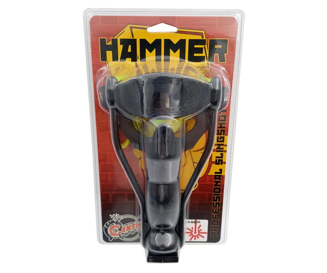 Увесистая большая рогатка Centershot Hammer с тяжелой пистолетной рукоятью и упором будет удобна даже самому крупному мужчине. На рогатке имеются несколько прицельных приспособлений: диоптрический прицел по центру между рогами, а также специальные целики на каждом роге рогатки. Кроме того, снизу в рукоятке располагается магазин для 8-ми миллиметровых шариков. Подача снарядов осуществляется с нажатием специальной кнопки.