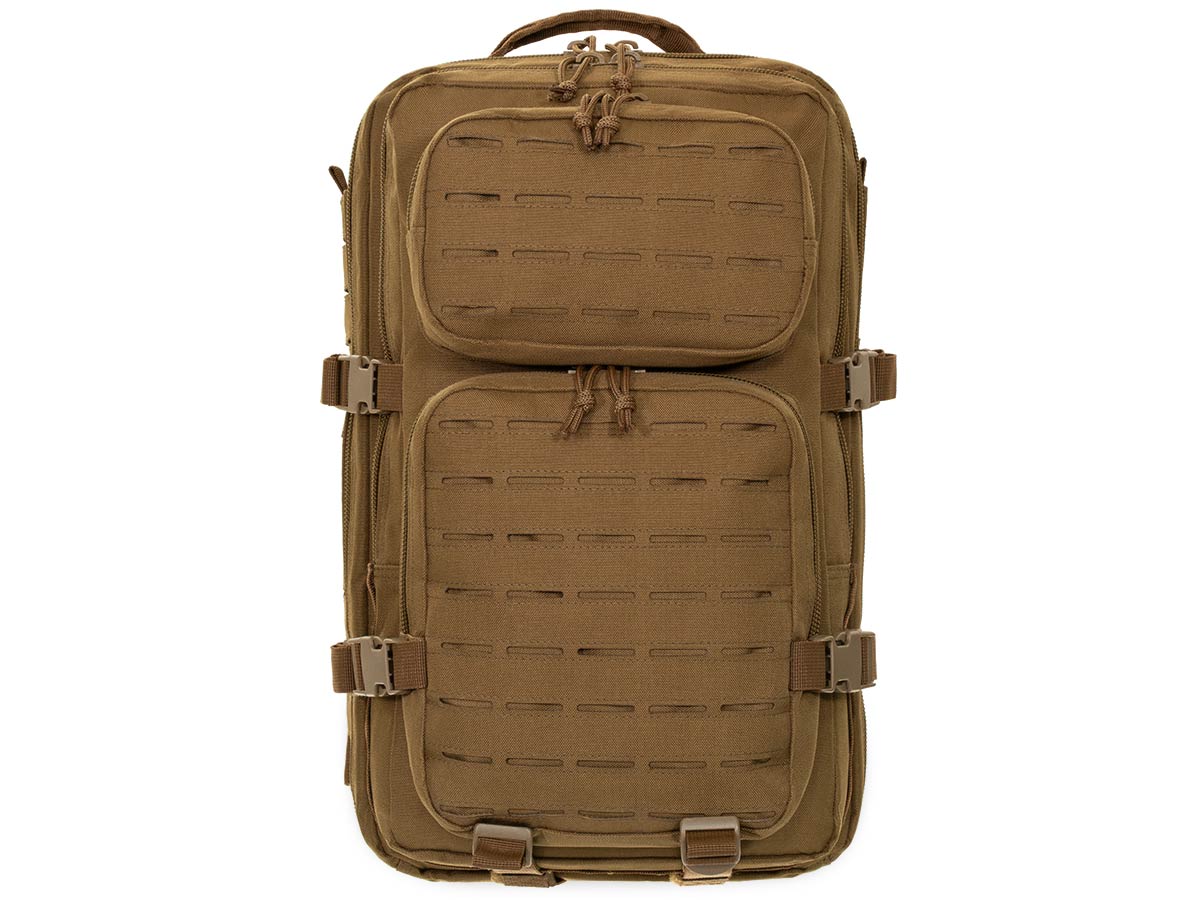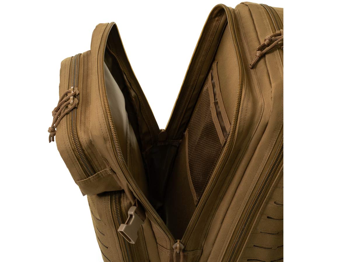 - Система MOLLE Lasercut для крепления дополнительного снаряжения на передних отделениях (3 стропы по 5 ячеек на маленьком и 7 строп по 5 ячеек на большом отделении)