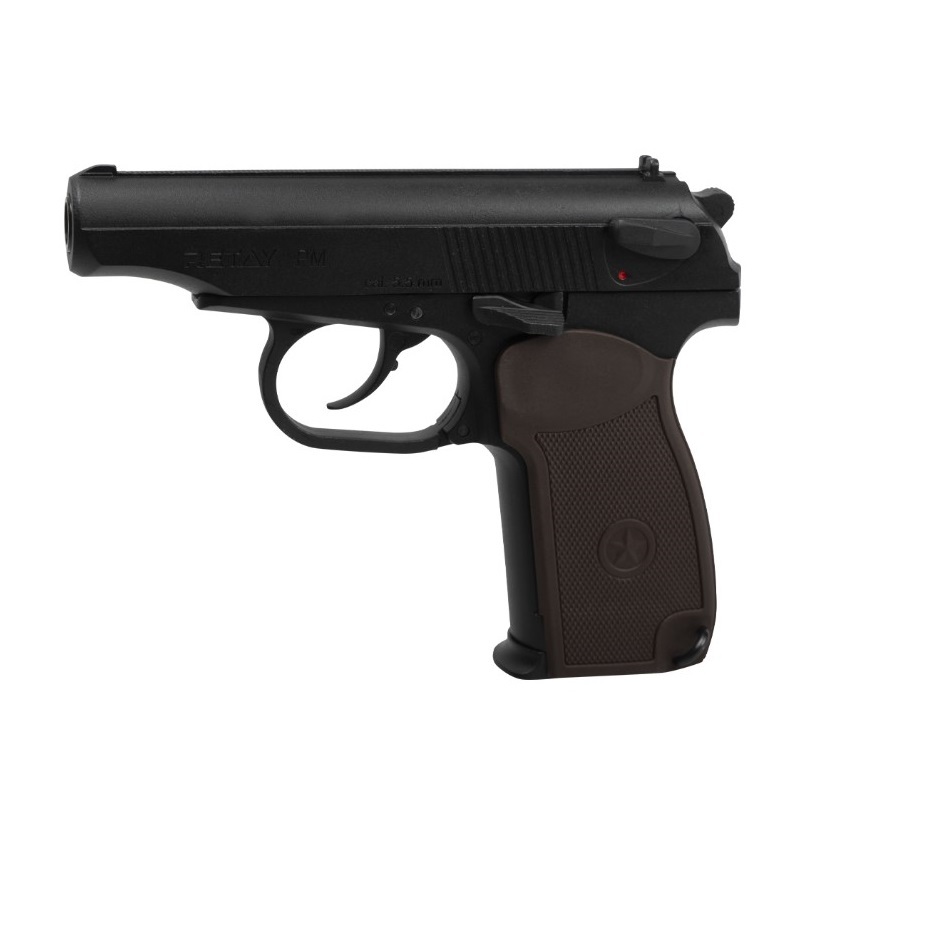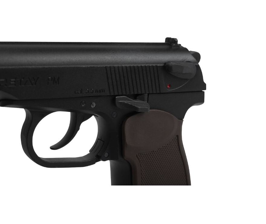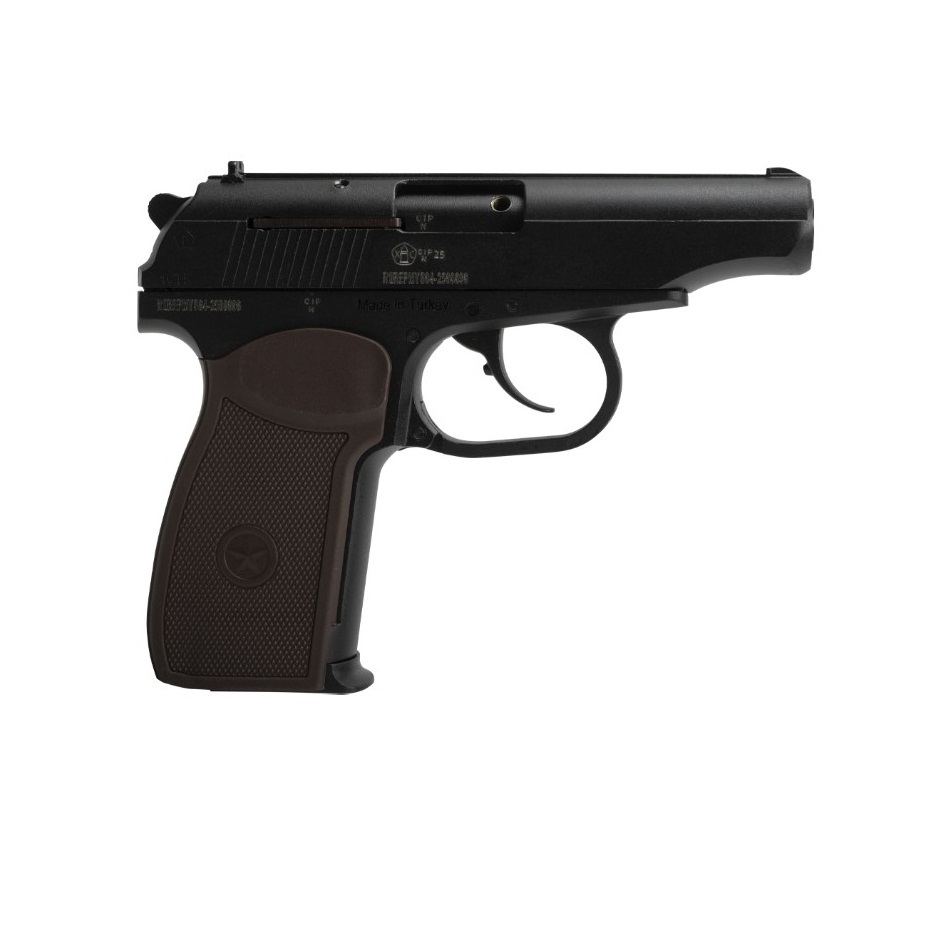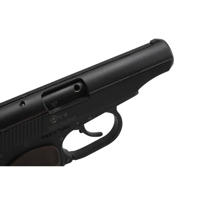 Материал: рамка, затвор и ствол - сплав Zamak; детали УСМ - сталь; накладки на рукоять - пластик