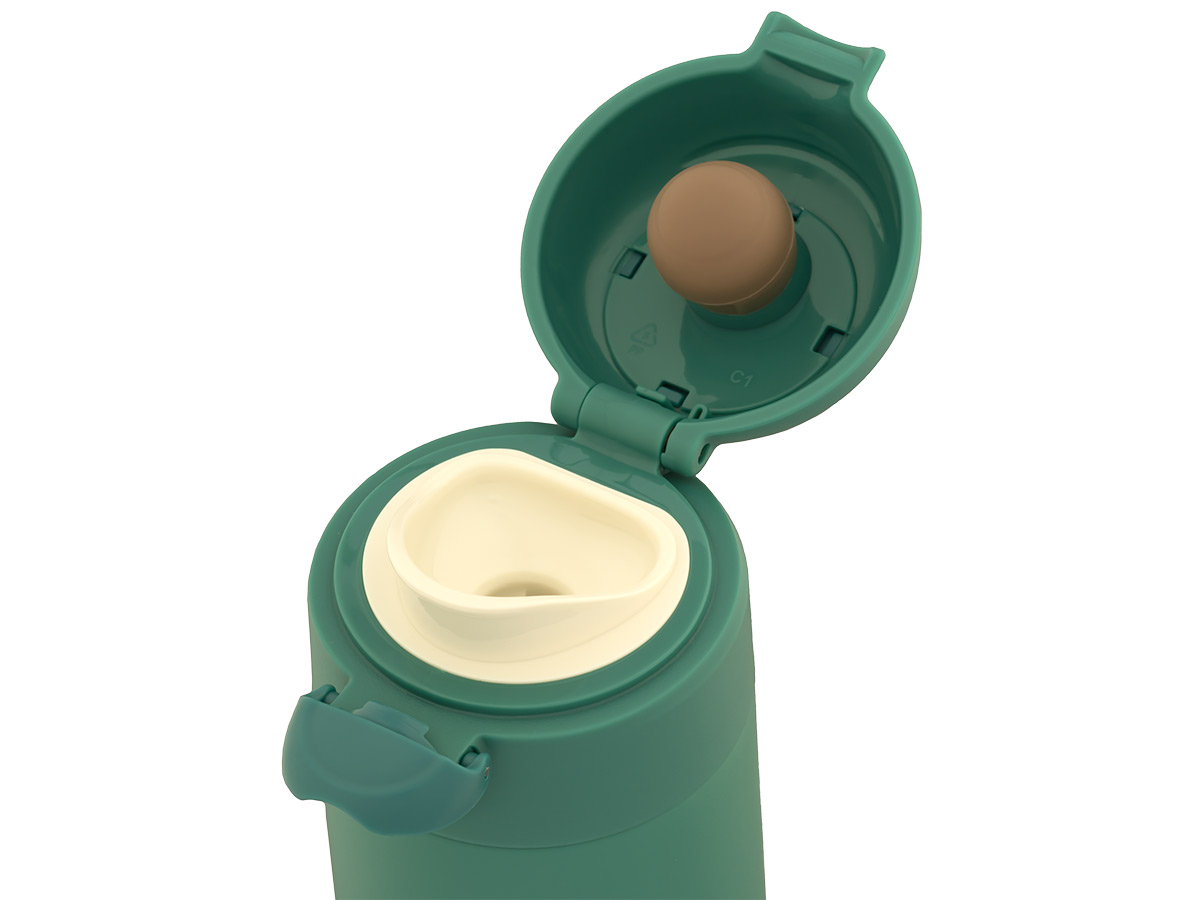 В открытом состоянии верхняя часть крышки автоматически фиксируется и не опрокидывается при питье. Удобный поильник позволяет пить непосредственно из термокружки, без использования чашек и выкручивания крышки-пробки. Узкое отверстие предотвращает расплёскивание напитка во время движения.