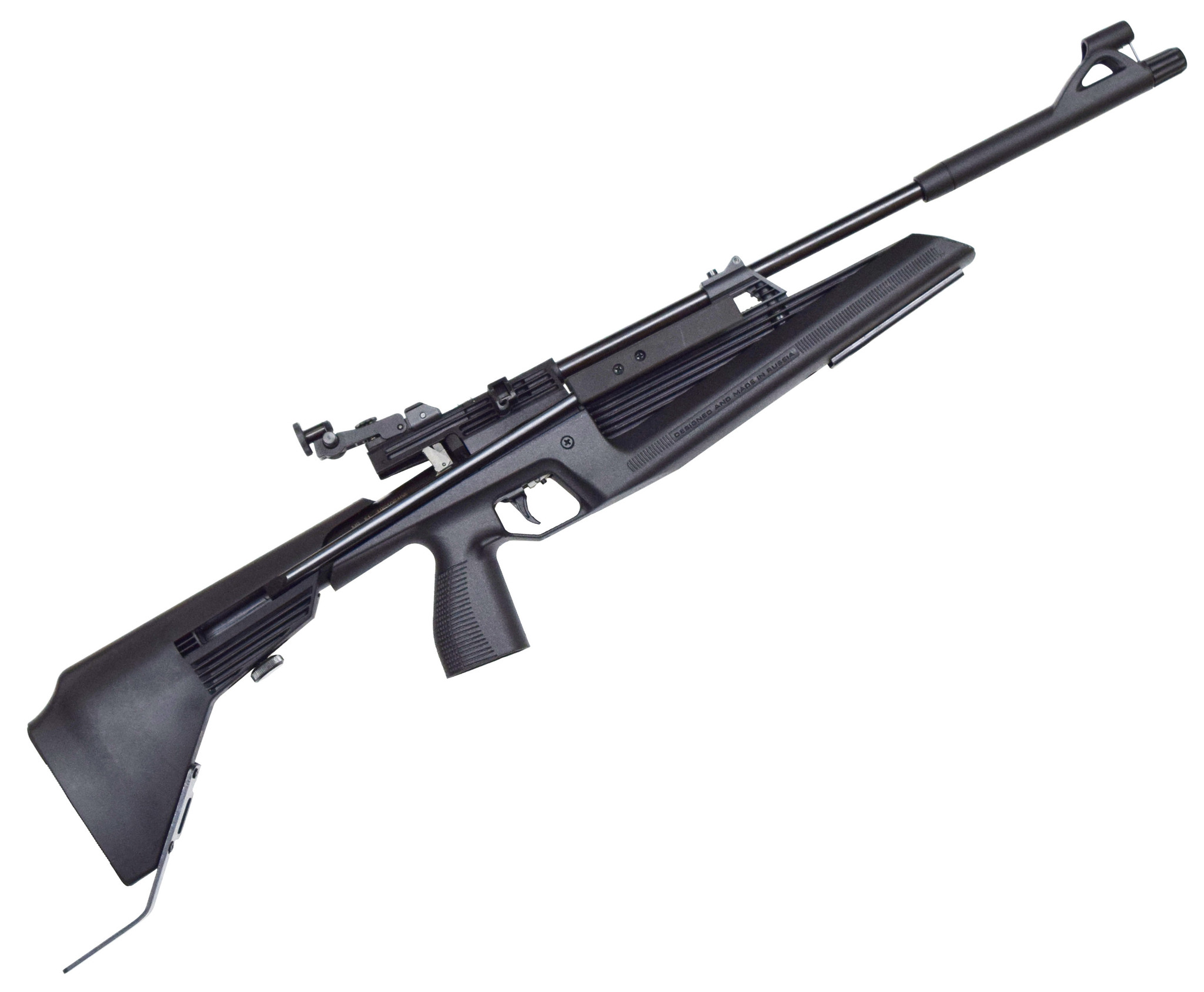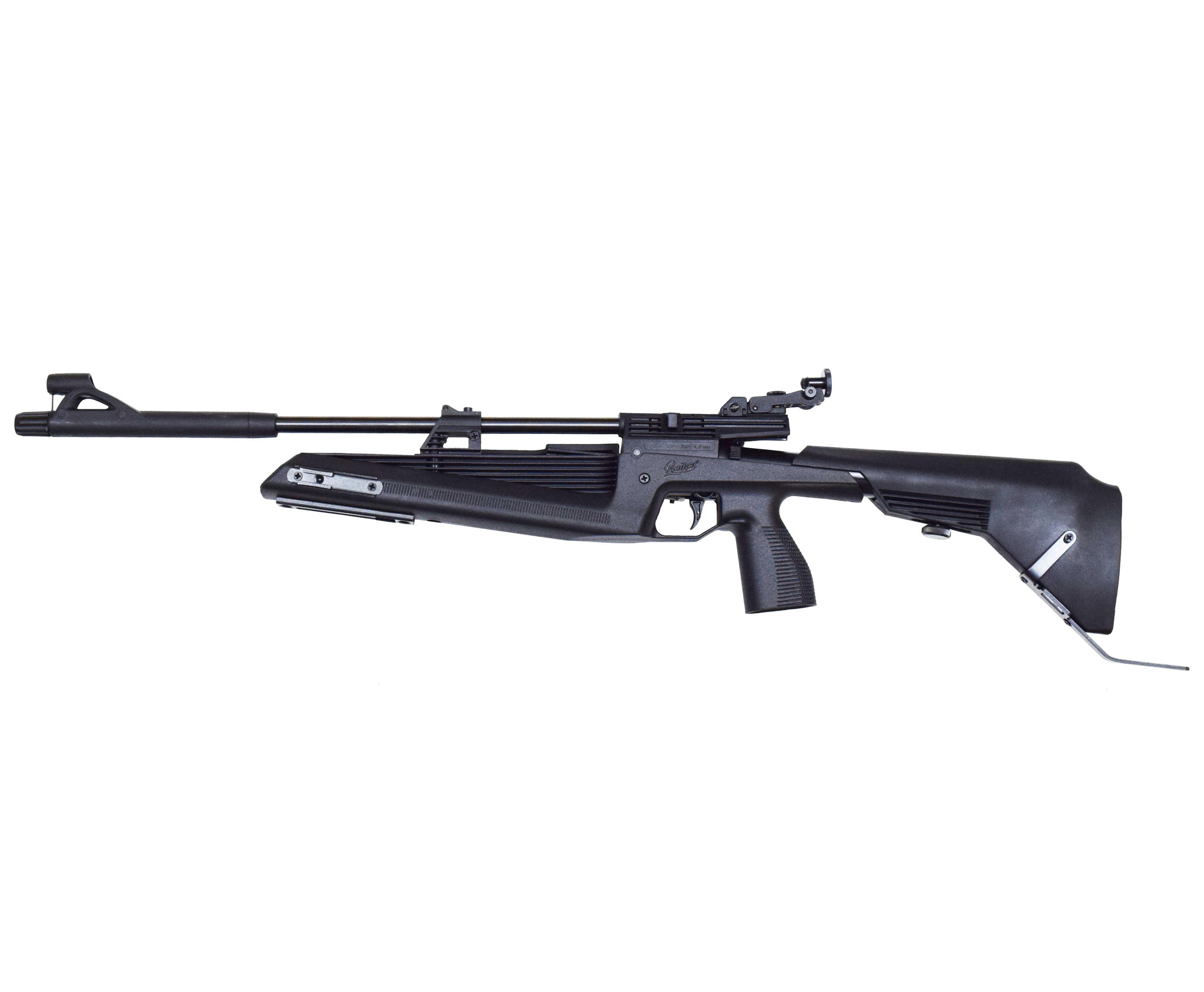 Качественная пневматика пружинно-поршневого действия, с боковым взводом и неподвижным стволом.