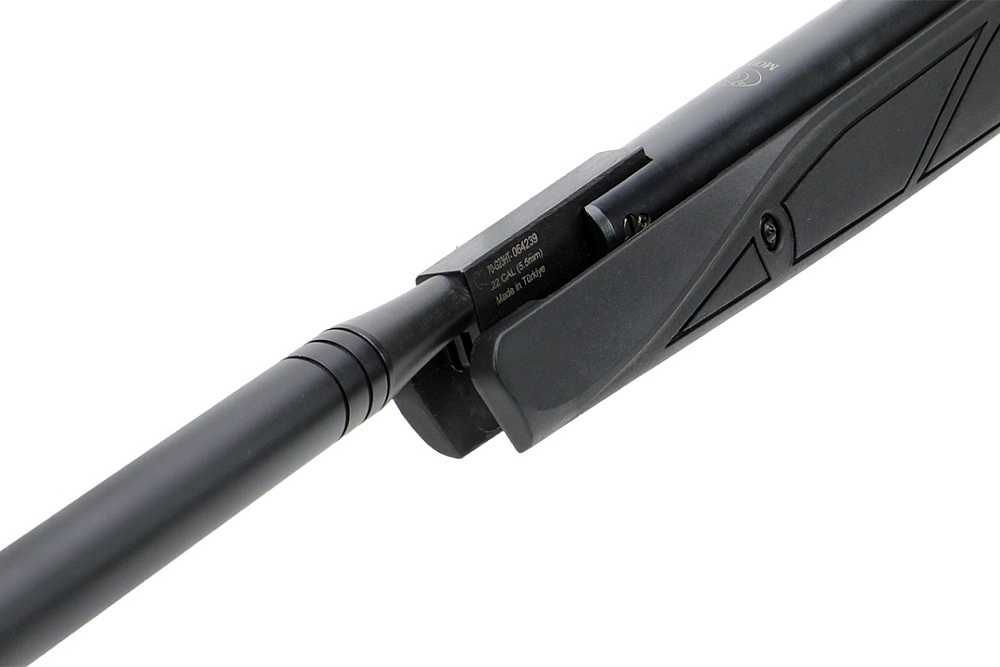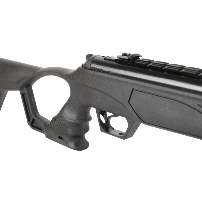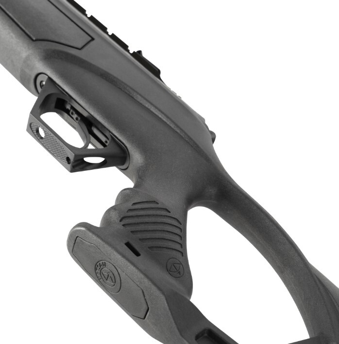 Винтовка Hatsan безопасна - в конструкции присутствует предохранитель. Элемент расположился за торцом компрессора - такое размещение помогает дотянуться до клавиши не отрывая руки от рукоятки. Спуск блокируется после каждого выстрела - механизм блокирует его после перезарядки.