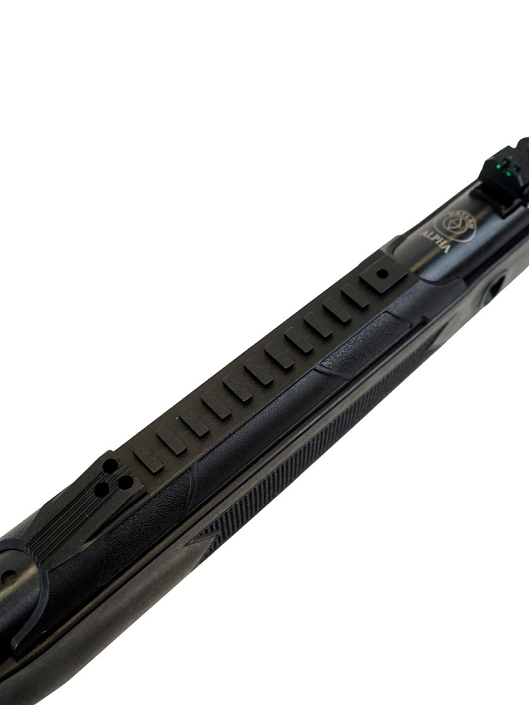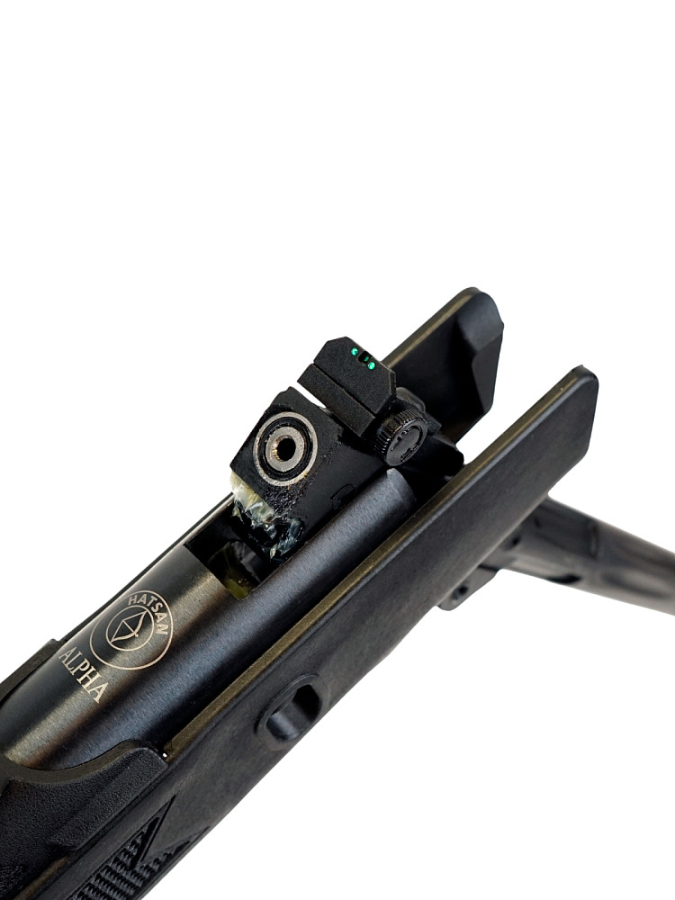 В винтовке Hatsan Alpha предусмотрен открытый прицел с мушкой, также установлена планка типа «ласточкин хвост», позволяющая использовать оружие с оптикой.