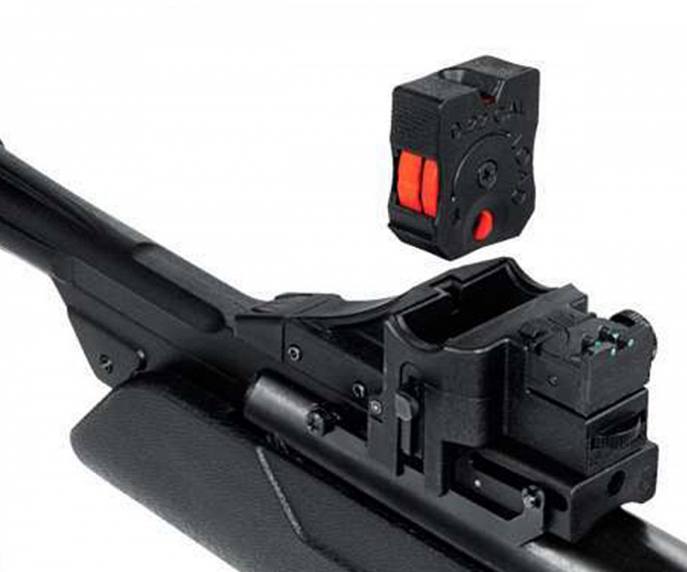 Пневматическая винтовка Hatsan SpeedFire – это многозарядная модификация от известного турецкого производителя, оружие с высоким темпом стрельбы. Взведение осуществляется стандартным способом – переламыванием ствола, однако сам процесс заряжания пулями автоматизирован. На стволе, в его верхней части, находится гнездо для сменных барабанных магазинов, каждый магазин рассчитан на 12 боеприпасов 4,5 мм.