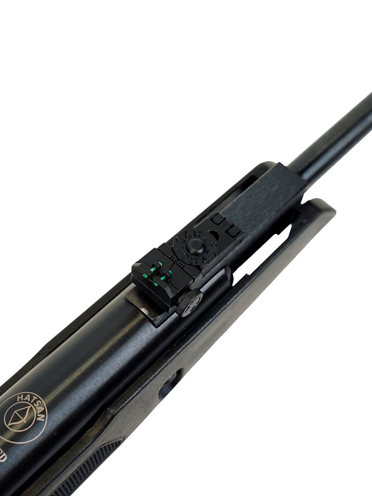 Такого показателя Hatsan добились благодаря замене некоторых элементов на высококачественный пластик. На данной модели установлена мушка с фиберогласовыми нитями. Это значительно упрощает стрельбу новичку. Если у вас возникнет желание поставить на винтовку оптический или лазерный прицел, вы сможете это сделать благодаря наличию одиннадцатимиллиметровой планки.