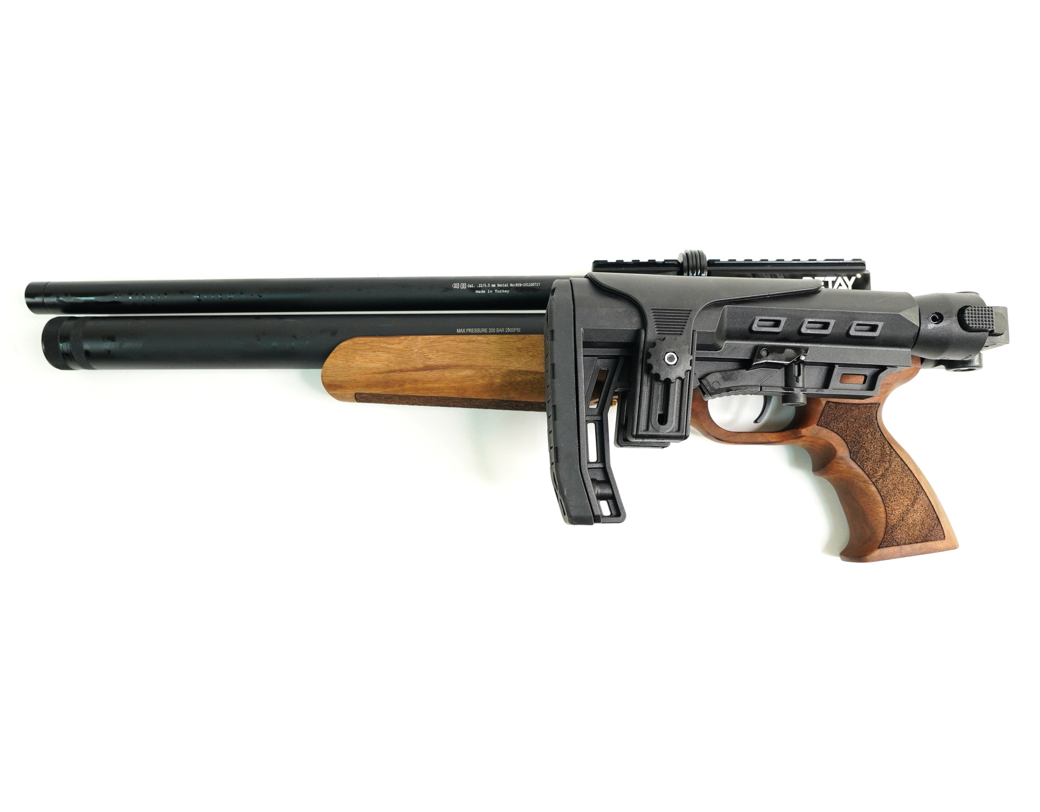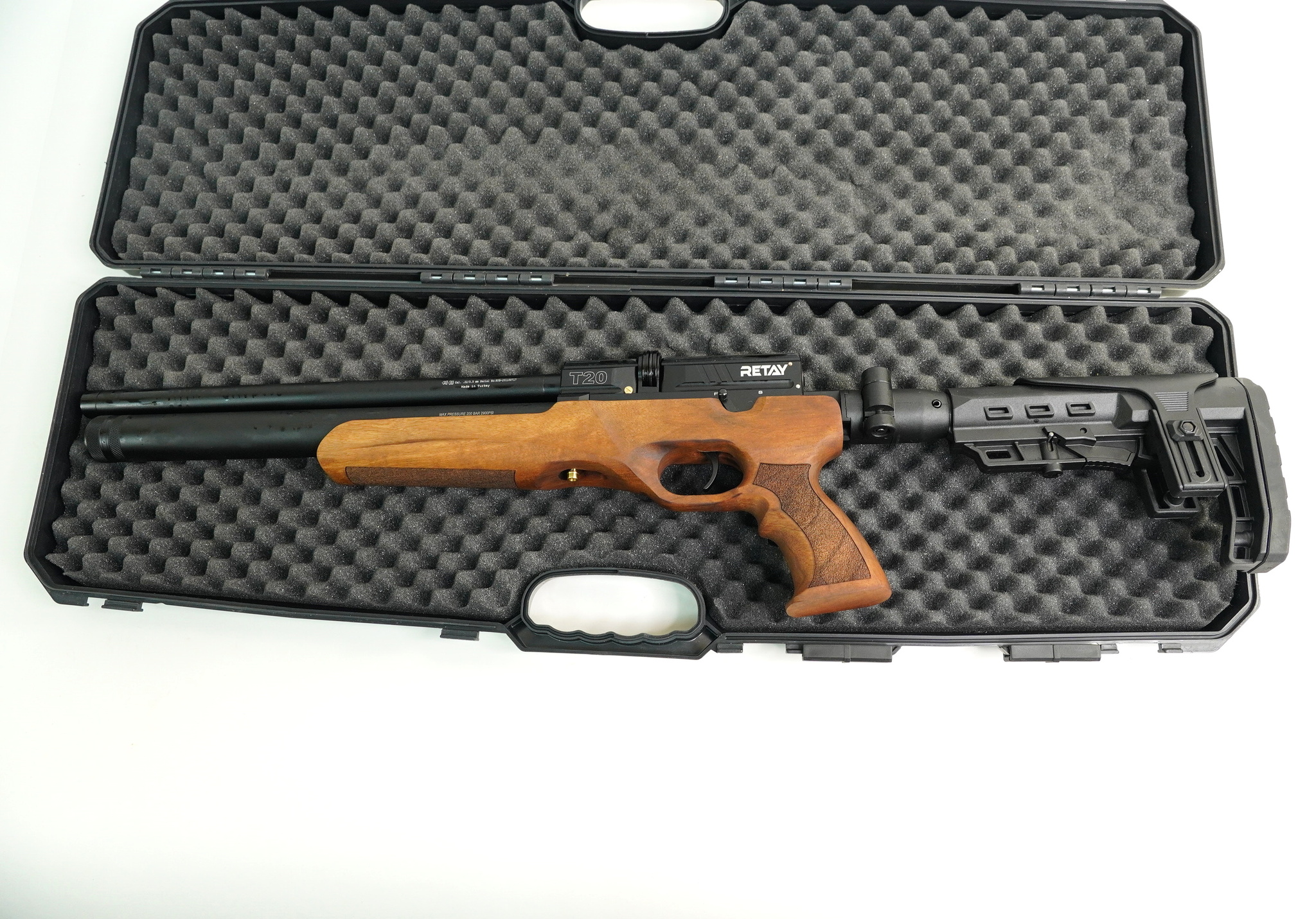 Складной телескопический приклад регулируется как по длине, так и по высоте. Удобная прорезиненная пистолетная рукоять обеспечивает надежный хват. Конструкция спускового крючка обеспечивает плавный спуск, что позволяет произвести более точный выстрел. В сложенном виде модель очень компактна. Эта версия пневматической винтовки РСР 'Retay T20 Wood' использует пульки калибра 5,5 мм.